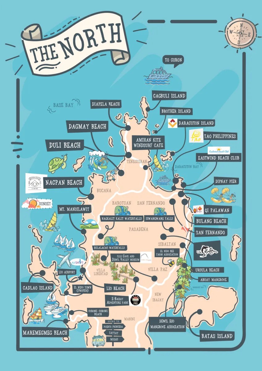 Explore the breathtaking northern region of El Nido, Palawan, with this detailed and visually stunning map. It highlights iconic destinations like Nacpan Beach, Duli Beach, and the surrounding islands, along with key attractions such as hiking trails, scenic viewpoints, and cultural landmarks. Perfect for adventurers and travelers, this map serves as a handy guide for navigating the area’s pristine beaches and lush landscapes. Whether you’re planning your next getaway or simply dreaming of paradise, this map provides everything you need to discover the beauty of El Nido’s north.