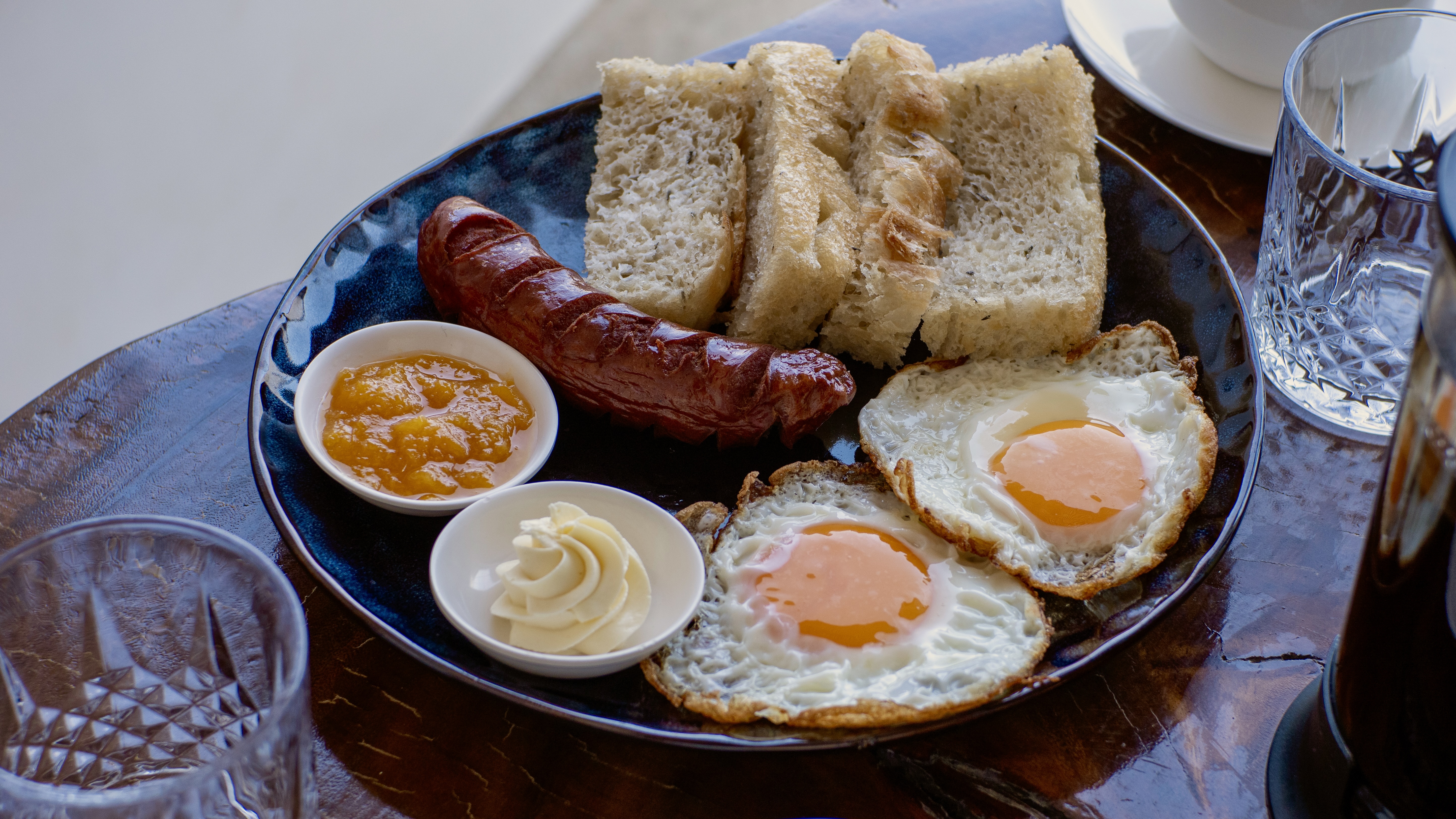 Hotdog, fried egg, garlic rice, served with homemade mango-coco jam & whipped butter