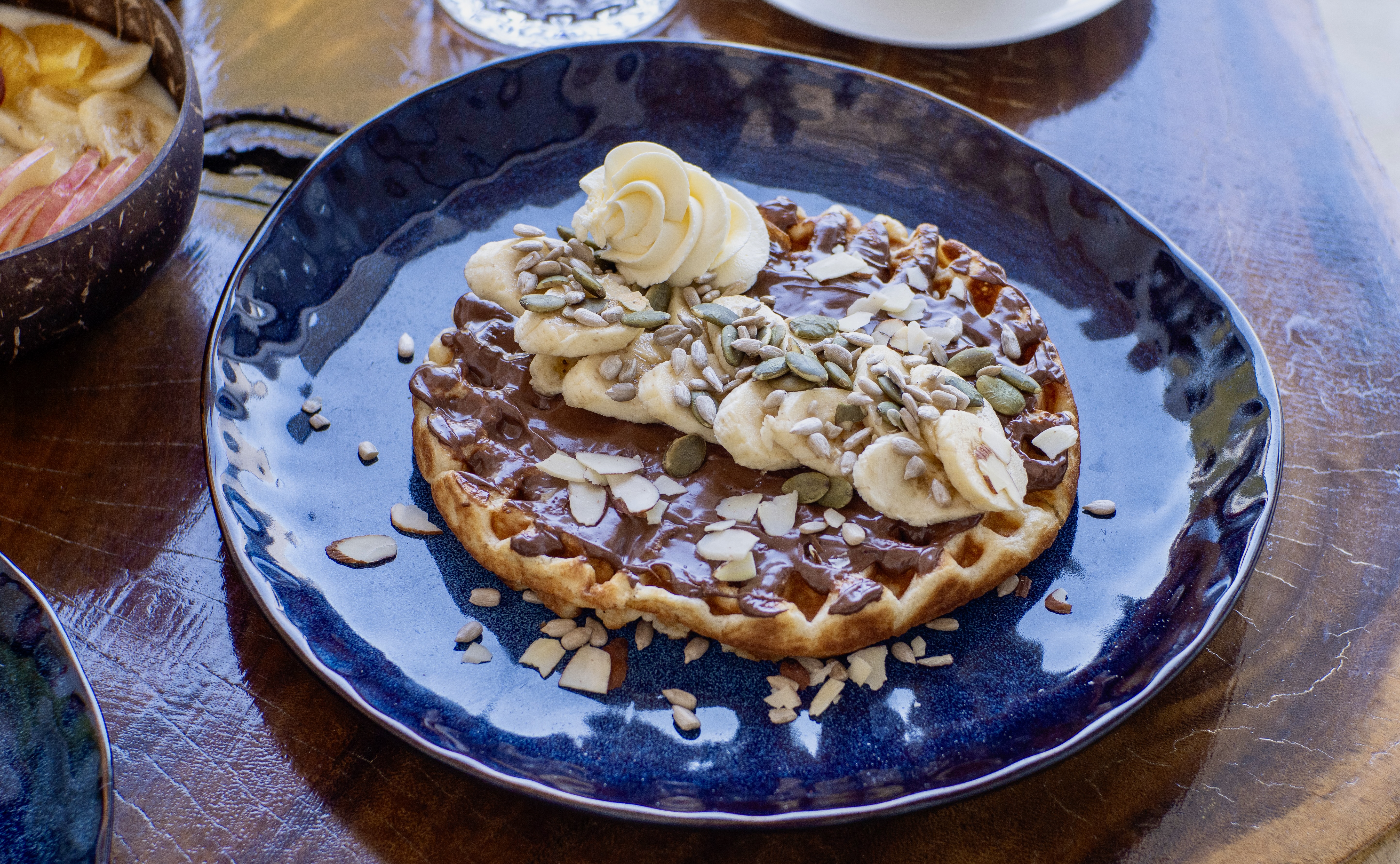 Waffles with banana & Nutella, topped with mixed nuts & seeds