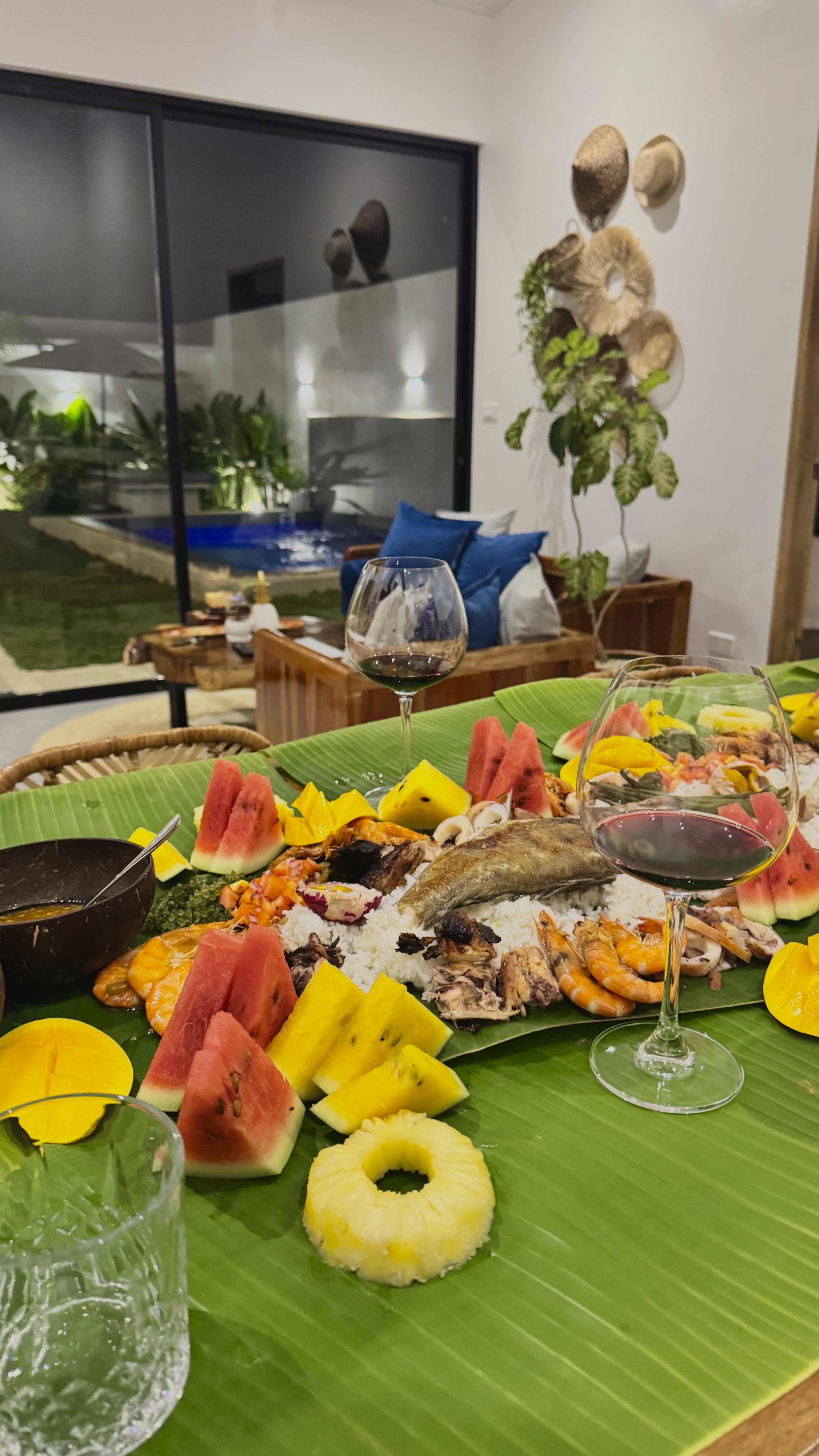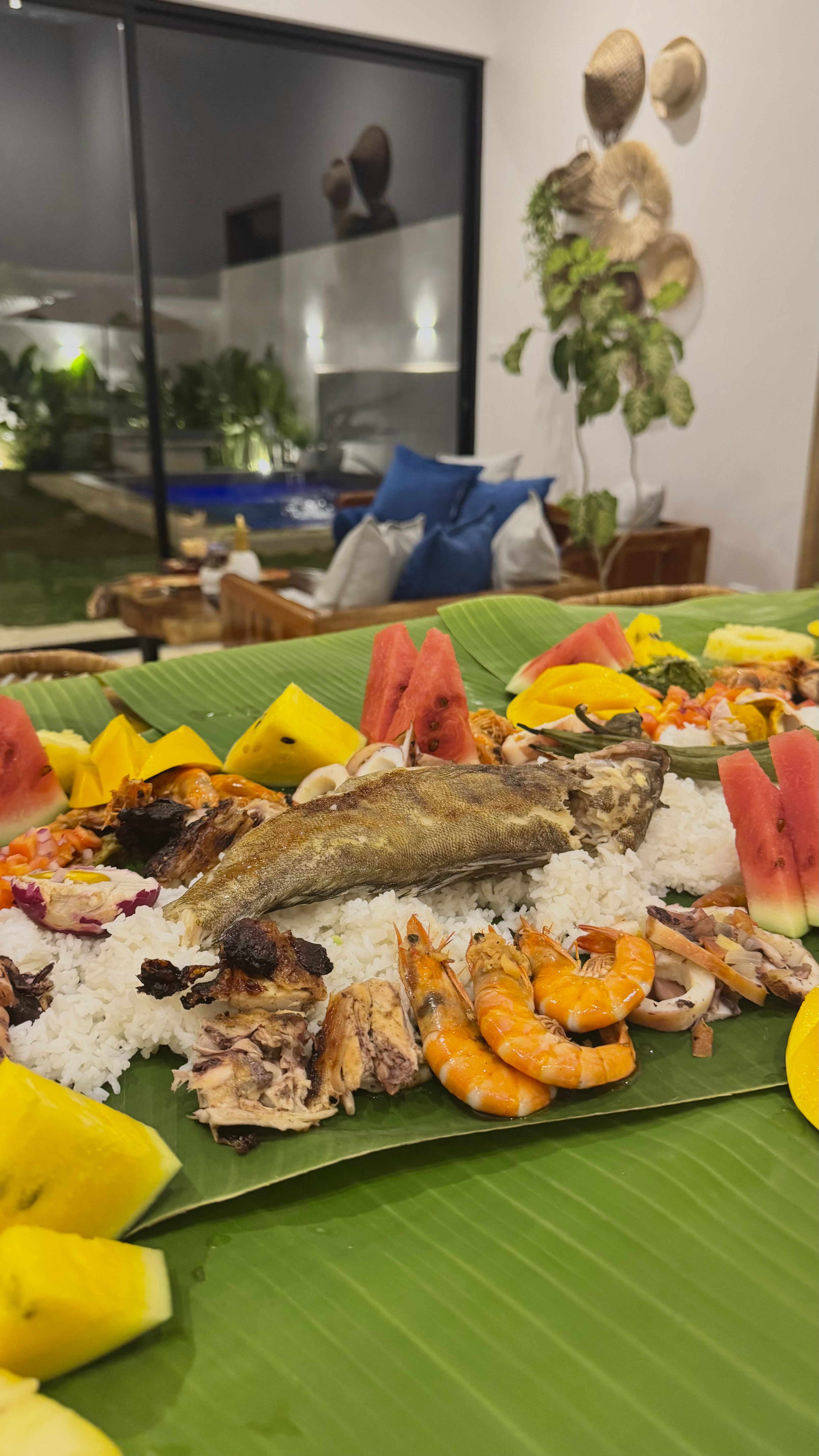 Our boodle fight features a generous spread of grilled pork and chicken, freshly grilled fish, and buttered garlic shrimp, served alongside eggplant salad, cucumber salad, seasonal fruits, steamed rice, and refreshing drinks.